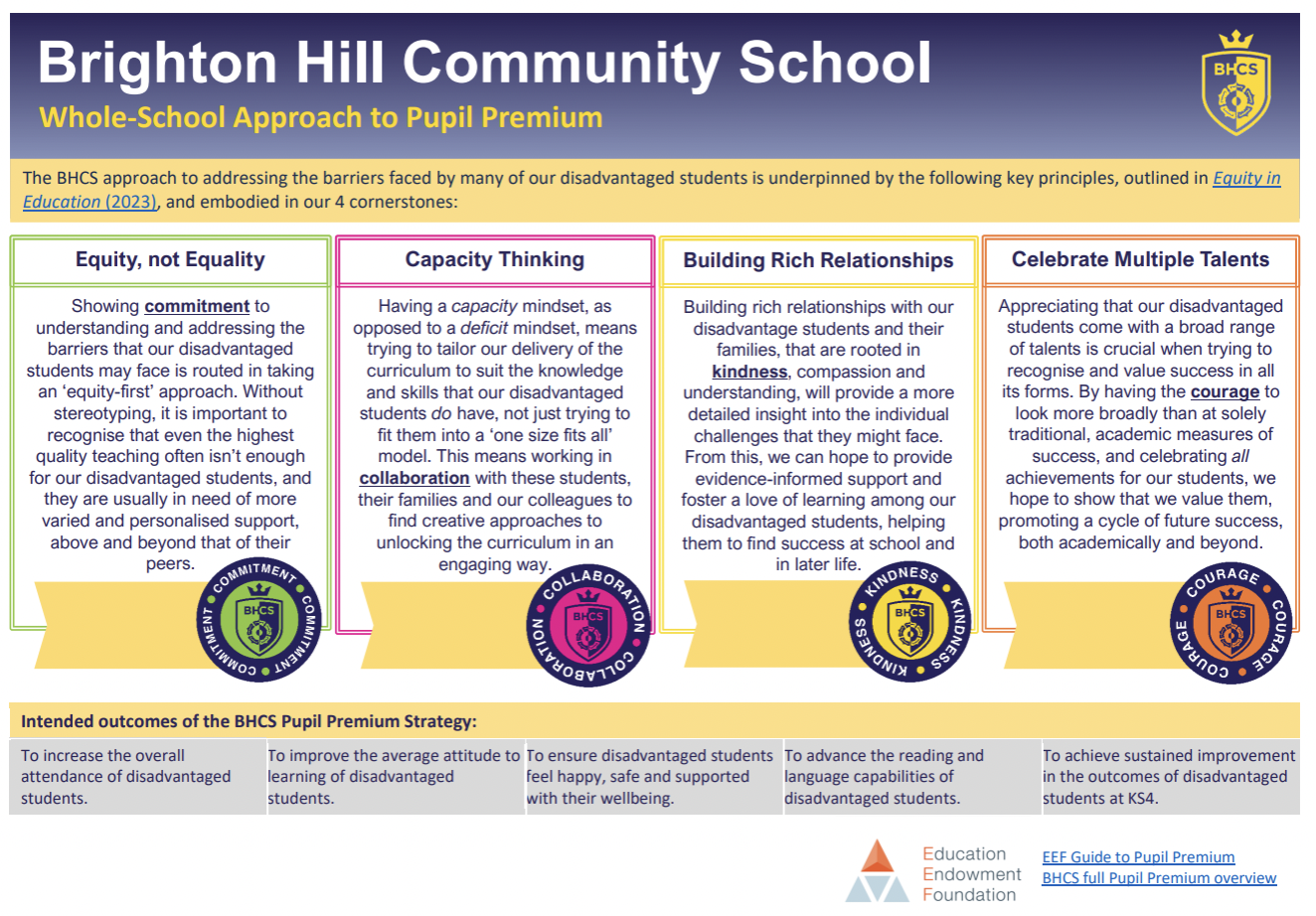 Our aim at Brighton Hill Community School is to ensure that all of our students, including those where circumstances may put them at a disadvantage to their peers, have a happy, safe and effective learning environment. From this, we hope they can acquire the knowledge and skills necessary to be successful, both during their time with us and in later life.